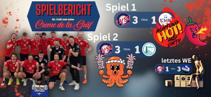 Doch daraus wurde nichts. Mit fast voller Kapelle (aus dem Stammsechser fehlte unsere Diagonalwaffe Denis, ersetzt durch Geheimwaffe Anton) traten Wilfredos Männer an, um den Tabellenstand zu korrigieren – und es gelang. Die Landeshauptstädter reisten ebenfalls mit einem großen Kader an und beeindruckten zunächst mit ihrem Gardemaß und elegantem Einschlagen. Doch der VSV hielt mit Stabilität und Routine dagegen. Nach anfänglichem Gleichschritt (14:13) fanden Käpt’n Gräfs Schergen die Lücken im Erfurter Spiel, legten einen kleinen Zwischensprint ein (21:15) und gewannen den ersten Satz überraschend klar mit 25:18.